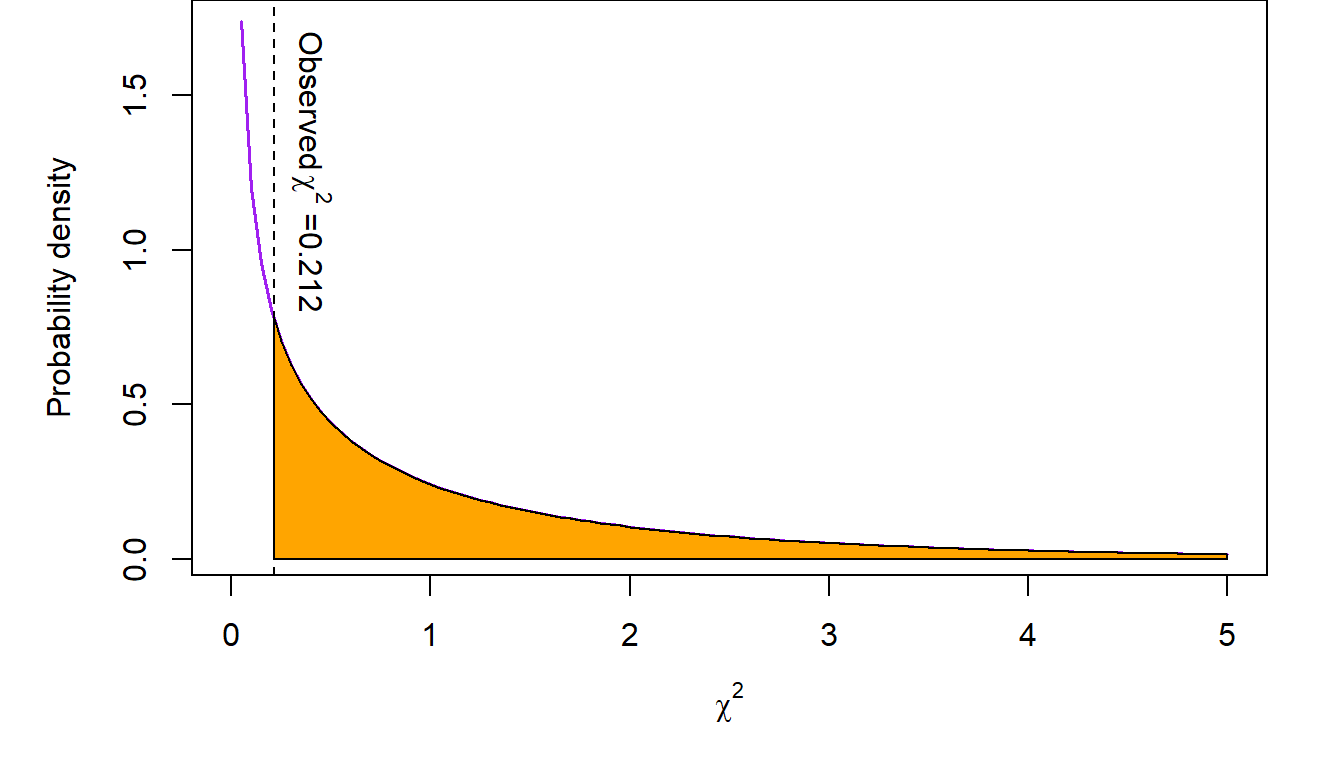 Let’s implement the chi-square test in the ovarian cancer example. The chi-square statistic is \[X=\frac{(21 -19.8)^2}{19.8}+ \frac{(18-19.2)^2}{19.2} + \frac{(50-51.2)^2}{51.2} + \frac{(51 -49.8)^2}{49.8}= 0.212\] The p value associated with this test statistic, compared to a chi-square distribution with \(1=(2-1)\times (2-1)\) degrees of freedom, is \(p=0.645\). The pictorial representation of this test is shown in the following figure.