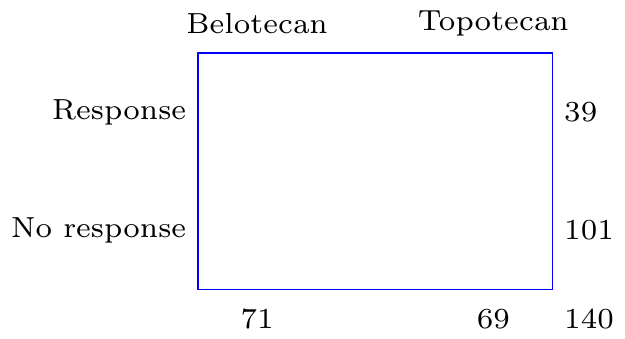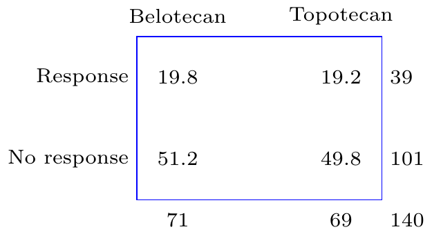 So slightly less people would be expected to have responded in the belotecan arm, 19.8 versus 21, and slightly more people would be expected to have responded in the topotecan arm, 19.2 versus 18, if there were no association between which treatment was taken and response to the drug. In addition, slightly more people, 51.2 versus 50 would be expected not to respond in the belotecan arm and slightly less, 49.8 versus 51, in the topotecan arm.