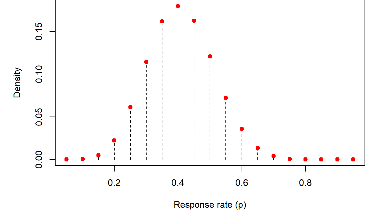 In many cases we do not know what \(p\) is. For example, when we evaluate the response to a new drug, we do not know what the probability of a favorable response will be for someone taking the experimental medication. All we will be able to observe is the number of people with some given characteristic (e.g., a cancer diagnosis) who took the medication and the number among them that experienced a favorable response. In this case, we need to turn the problem on its head. Instead of asking what is the probability of seeing \(x\) responders out of \(n\) patients, if the response rate is \(p\), we ask what is the probability that \(p\) is such and such, given that I have observed \(x\) responders out of \(n\) people who received the drug.