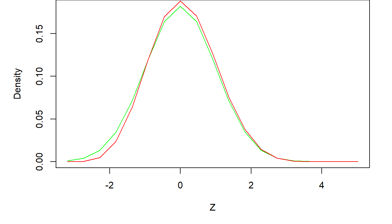 Figure 8.3: Exact (red) distribution of the response rate p and distribution based on the normal approximation (green).