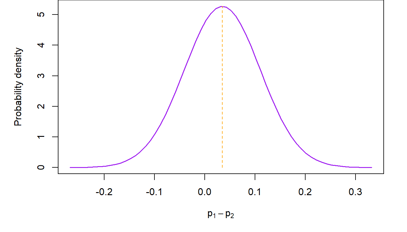 The simplest way to estimate the distribution of the difference of two proportions is by using the normal approximation to the binomial distribution. Statistical theory, which we will not go into here, prescribes that, assuming that \(n_1\) and \(n_2\) are not too small and \(p_1\) and \(p_2\) too small or two large, the distribution of \(\hat p_1-\hat p_2\) is close to a normal distribution with mean \(p_1-p_2\) and standard deviation \(\sqrt{\frac{p_1(1-p_1)}{n_1}+\frac{p_2(1-p_2)}{n_2}}\).