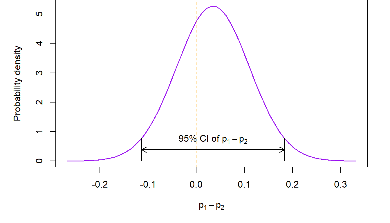 The ability to estimate the difference of two proportions is important for a number of reasons. It provides an idea of whether \(p_1\) and \(p_2\) are equal. In clinical investigation, this addresses the question whether the response to a new drug is higher compared to the standard of care. In epidemiology, these proportions may reflect whether the risk of occurrence of some disease is different among individuals who were or were not exposed to some risk factor.