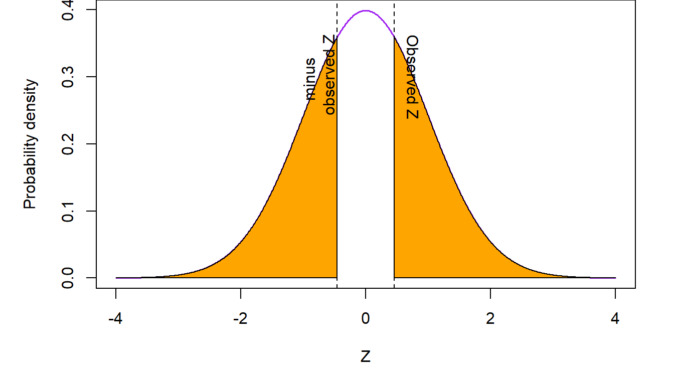The p value is calculated as the probability of seeing the observed \(Z\) value or any other value that is more extreme (i.e., to the right of a \(Z\) and/or to the left of a negative \(Z\) value) if our working hypothesis is true. If this probability is low (i.e., below our a priori specified alpha level) then we reject the null hypothesis, as low p values suggest that the evidence provided by the observed data are not consistent with the working hypothesis. In this case, we reject \(H_0:p_1=p_2\) and conclude that \(p_1\neq p_2\). Conversely, if the p value is high, then the probability that we see a difference like the one observed in this study is high, so the evidence produced by the data is consistent with the null hypothesis. In this case we do not reject the null hypothesis. The “and/or” in the definition of the p value above comes into play when the null hypothesis is two-sided. In this case, both the areas under the curve to the right of \(|Z|\) and the left of \(-|Z|\) are summed up. In the ovarian cancer example, our null hypothesis is two-sided (i.e., it does not imply direction of the superiority or inferiority in the difference) so the p value is calculated as shown in the colored areas of the next figure.