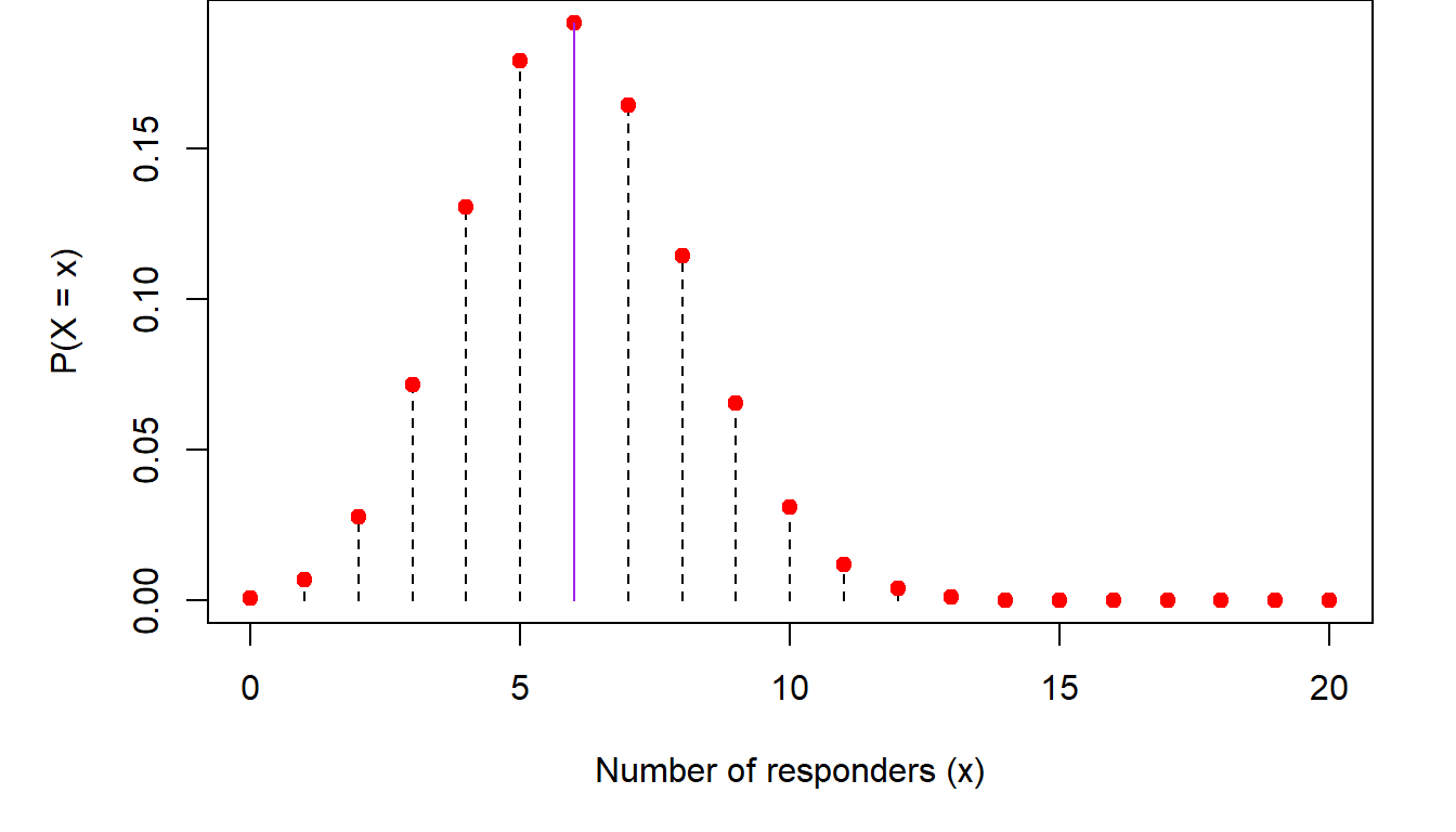 So, as we get away from the mean (shown in purple in the figure) in either direction, the probability of observing either too large or too small a number of responders decreases.