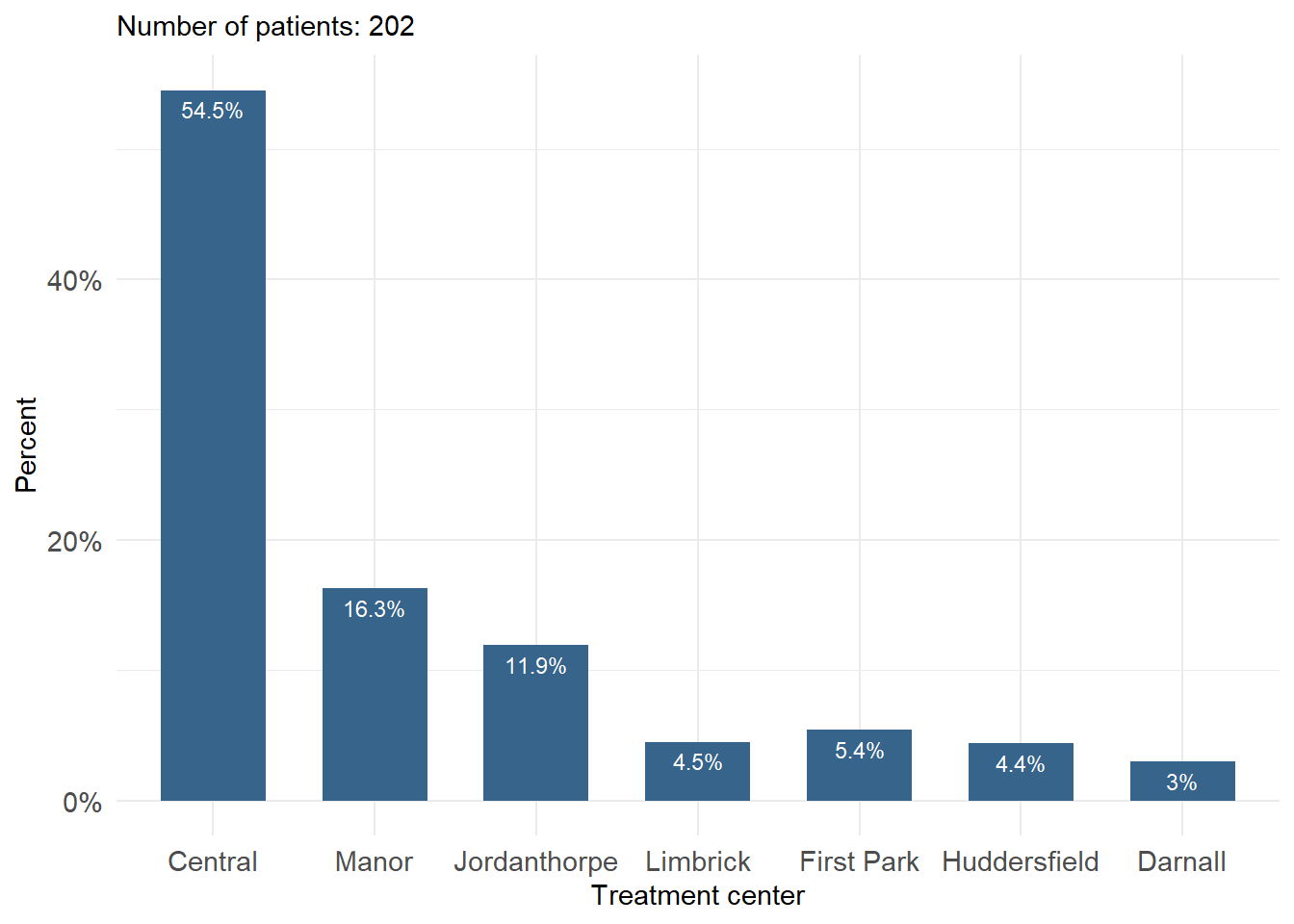 While frequency tables are extremely useful, the best way to investigate a dataset is to plot it. For categorical variables, such as gender and treatment center, it is straightforward to present the number in each category, usually indicating the frequency and percentage of the total number of patients. When shown graphically this is called a bar plot.