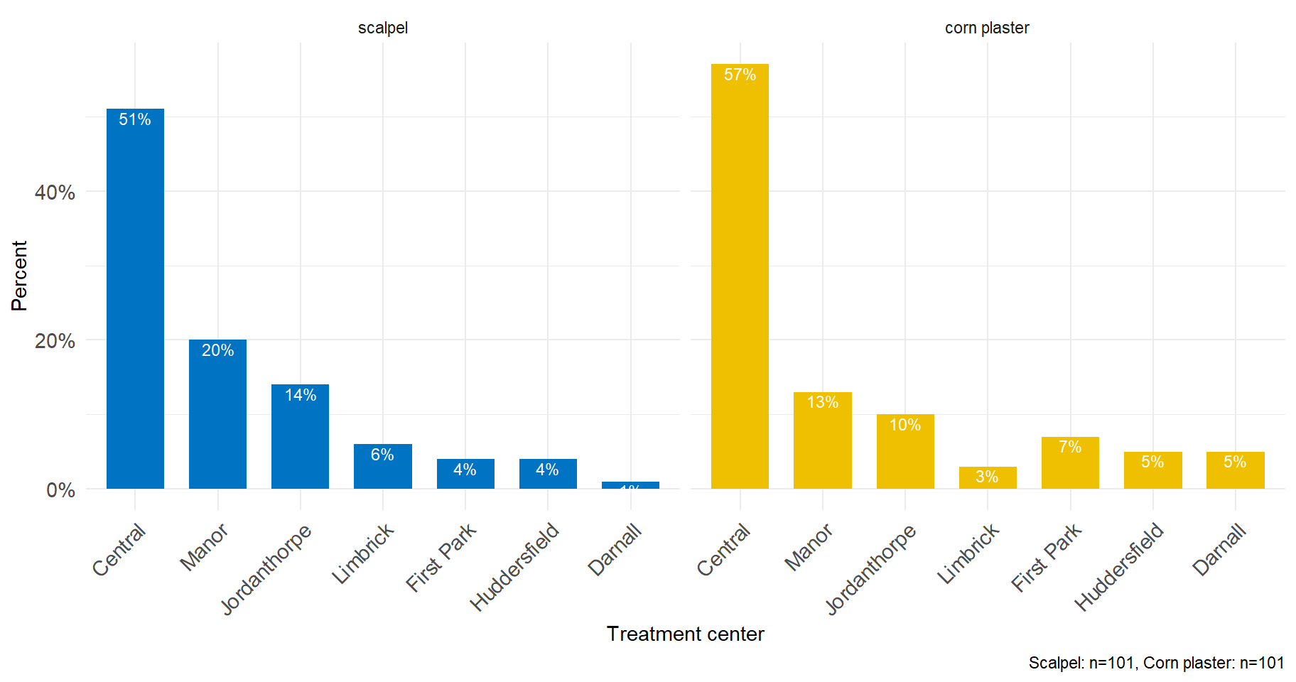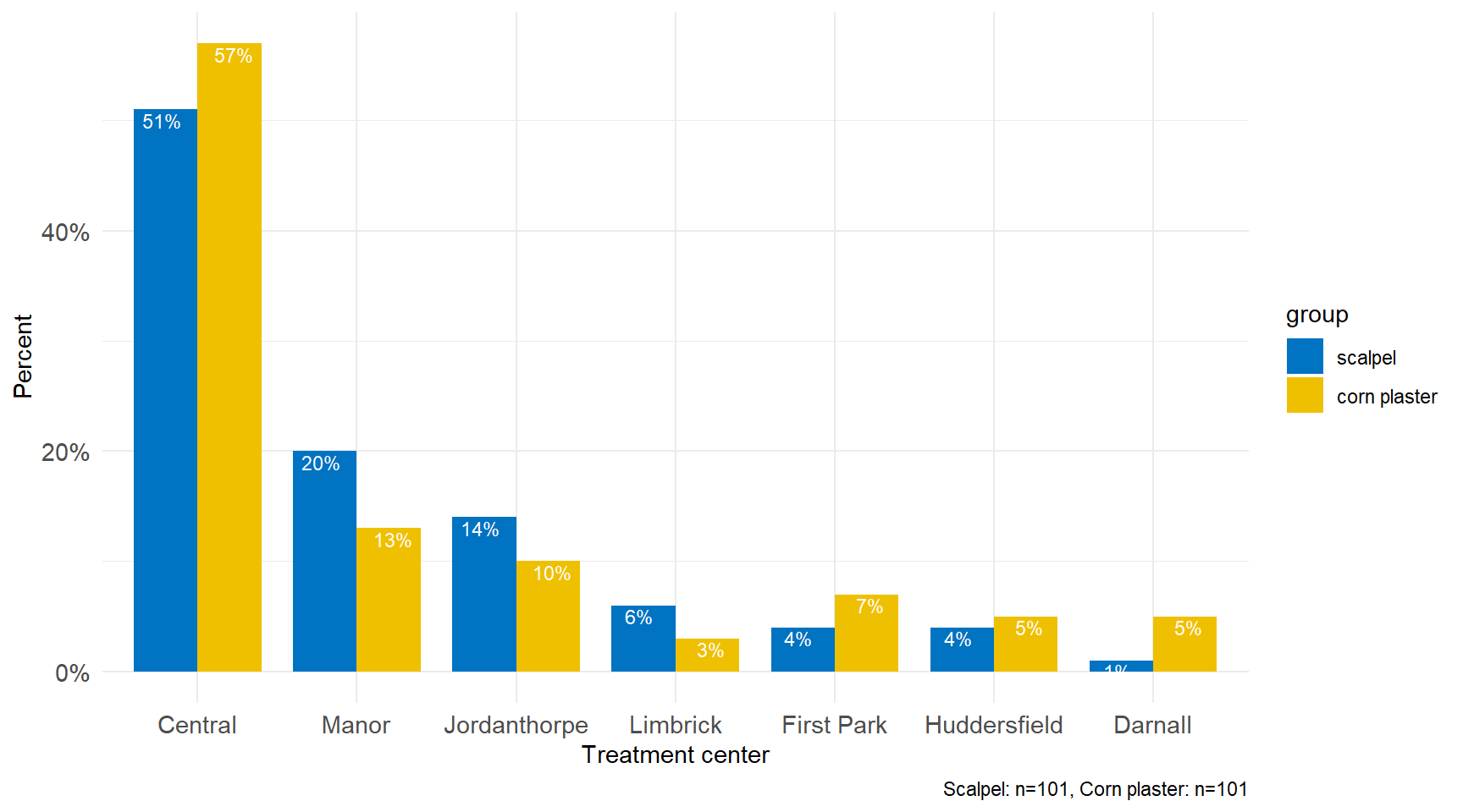 A simple bar plot is an easy way to make comparisons across categories. Figure 2.1 shows the centers where 202 patients with foot corns were treated in the trial of Farndon et al. (2013). Along the horizontal axis (x-axis) are the different treatment centers whilst on the vertical axis (y-axis) is the percentage. The height of each bar represents the percentage of the total patients in that category. For example, it can be seen that the percentage of participants who were treated in the “Central” center was about 55%.