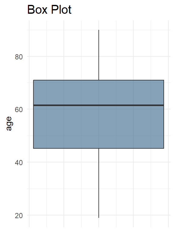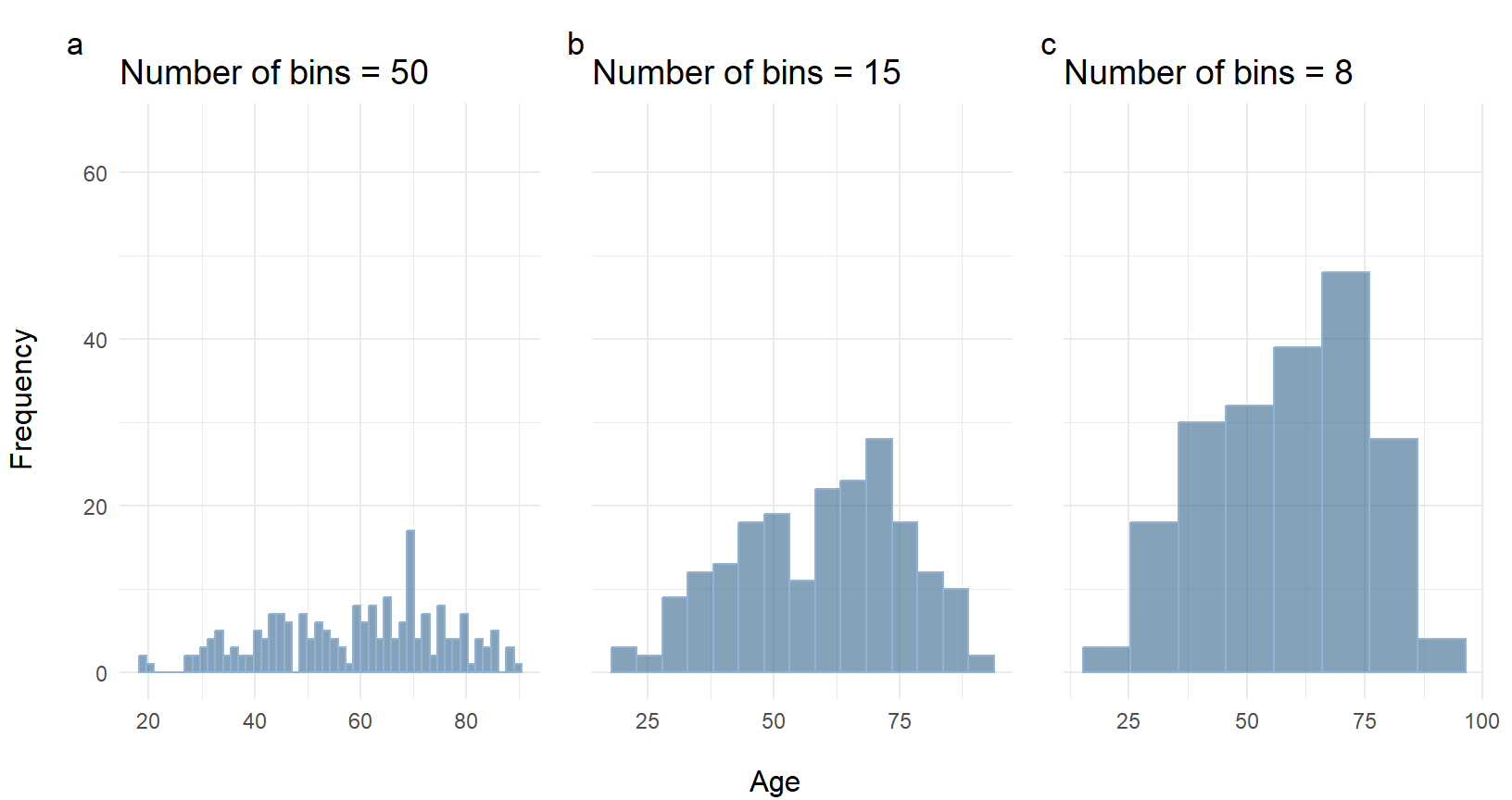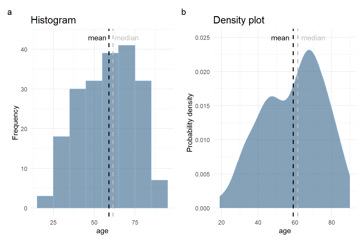 Figure 2.7 shows the distribution of age for the participants in Farndon et al. (2013) study. The vertical scale shows (a) frequency (histogram) or (b) probability density (density plot).