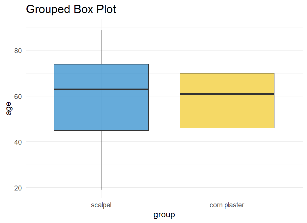 Figure 2.12 illustrates a grouped box plot that presents the age by treatment group.