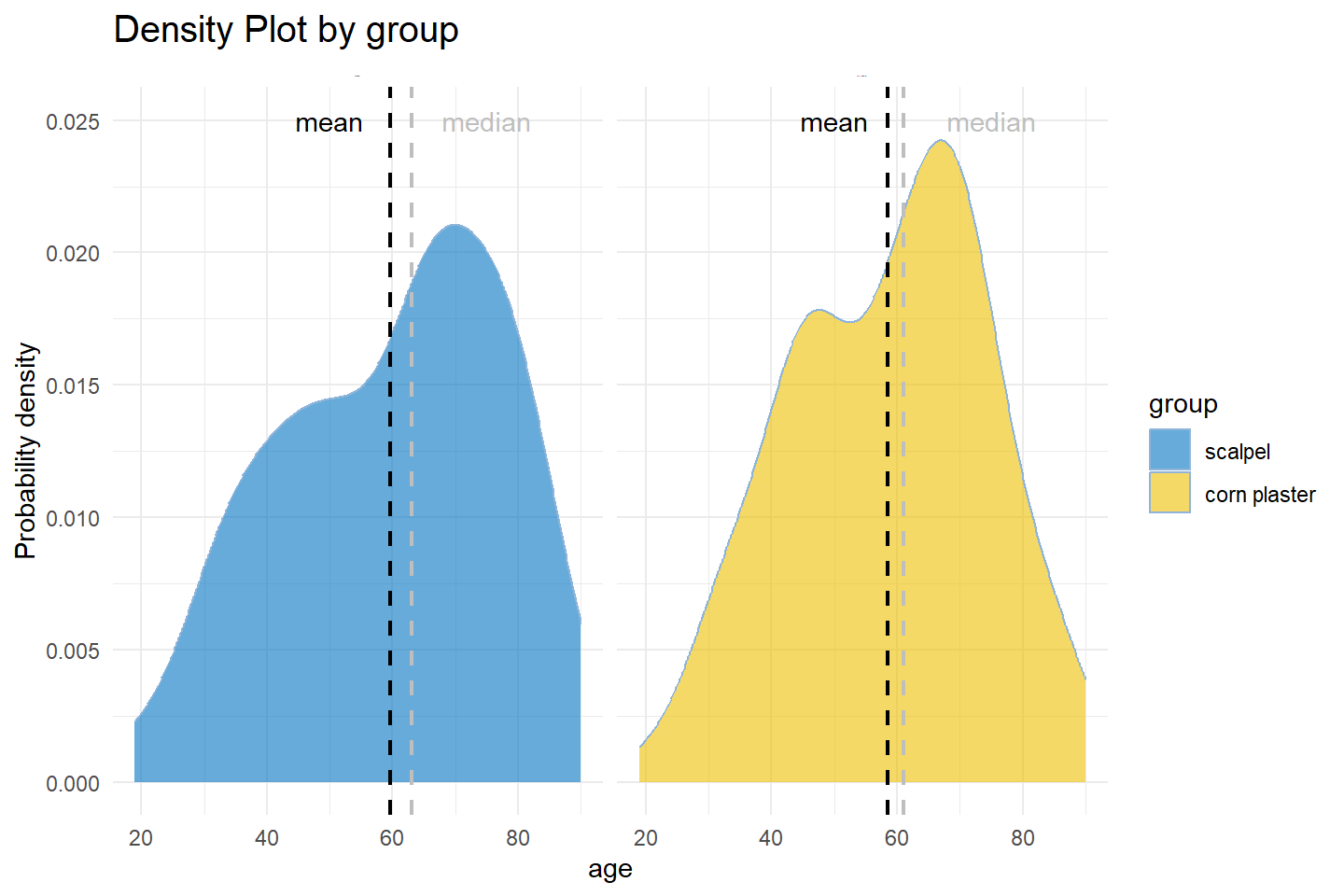 We can also create a histogram or density plot by group. Figure 2.9 depicts the probability density of age by treatment group.