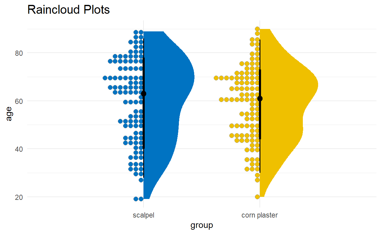 There are many variations of the boxplot. For example, there is a way to combine raw data (dots), probability density, and key summary statistics such as median, and relevant intervals of a range of likely values for the population parameter, in an appealing and flexible format with minimal redundancy, using the raincloud plot (Figure 2.13):