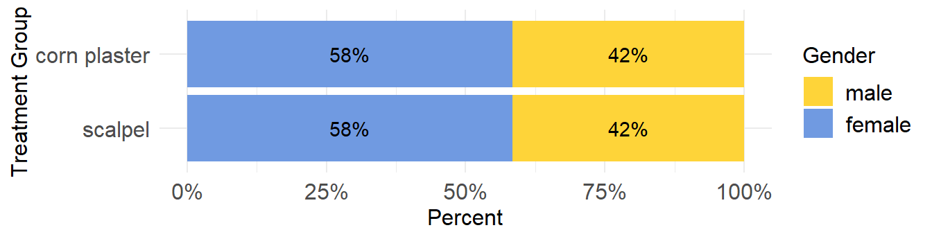 However, a raw count is rarely useful. For example, in ?tbl-corn there are more non-smokers in the scalpel group (40 out of 99 or 40%) compared to corn plaster group (34 out of 98 or 35%). It is only when this count is expressed as a proportion (relative frequency) that it becomes useful. Hence the first step to analyzing categorical data is to count the number of observations in each category (frequencies) and express them as proportions of the total sample size (relative frequencies).