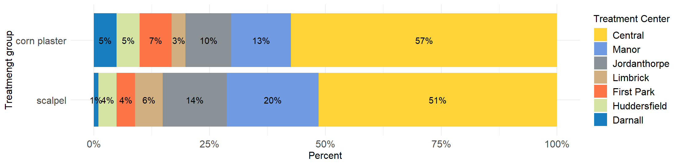 If the sample is further classified into whether the patient was treated with corn plasters or scalpel then it becomes impossible to present the data as a single bar plot. We could present the data as a side by side bar plot (see Figure 2.2) but is preferable to present the data in one graph with the same scales and axes to make the visual comparisons easier (grouped bar plot) (see Figure 2.3).