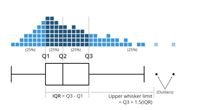 The interquartile range (IQR) is a useful measure of variability and is given by the difference of the lower and upper quartiles (IQR=\(Q_{3}\)-\(Q_{1}\)). It indicates the spread of the middle 50% (75%-25%) of the data.The IQR is an especially good measure of variability for skewed distributions or distributions with outliers.