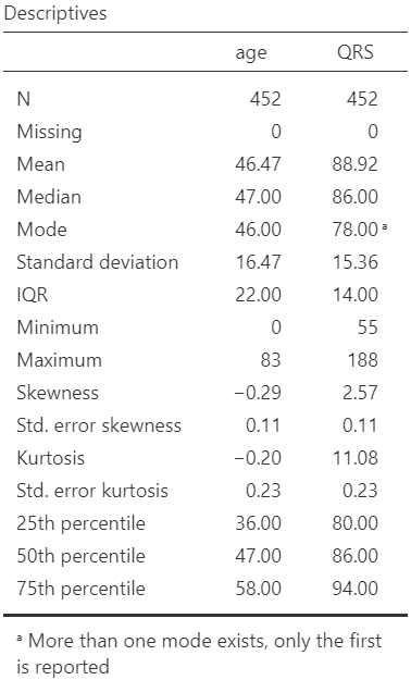 Figure 12.8: Descriptive statistics for variables age and QRS
