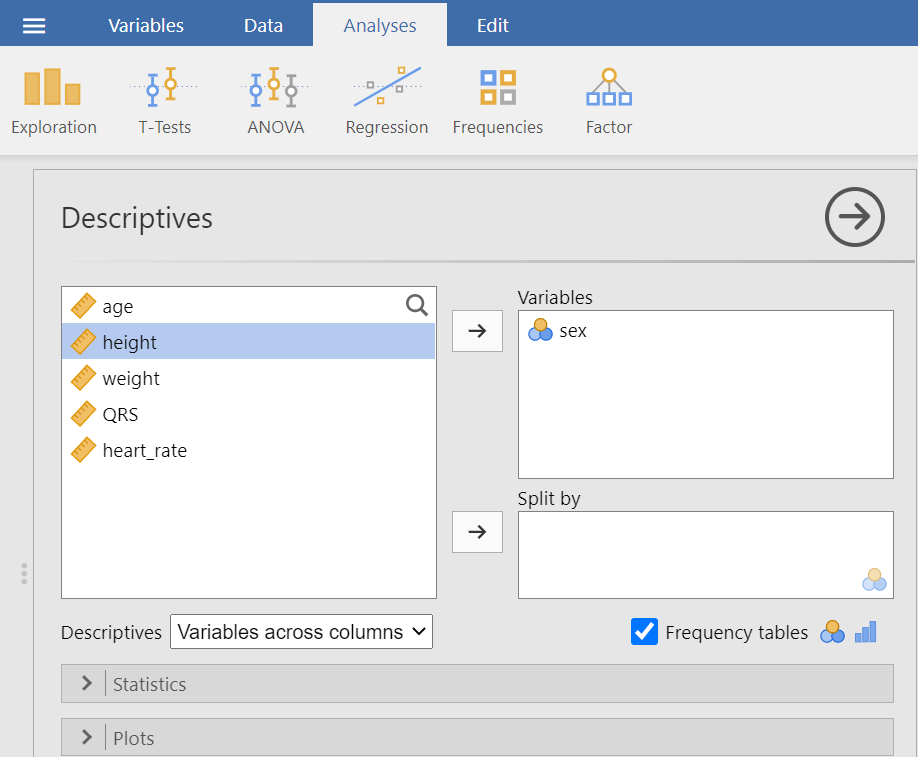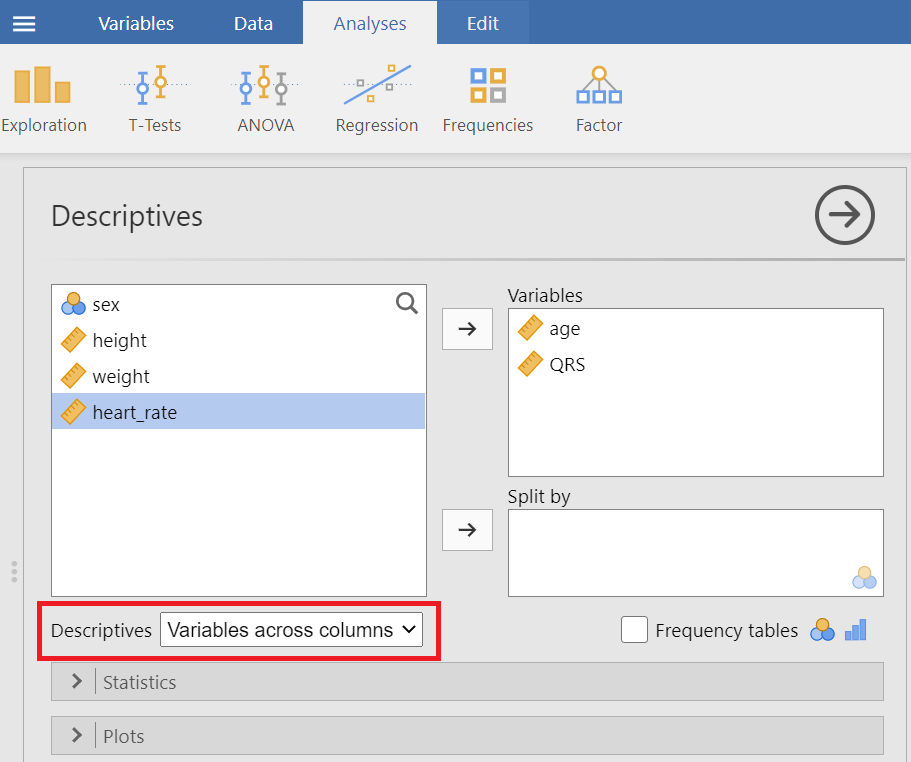 In the menu at the top, choose Analyses > Exploration > Descriptives.