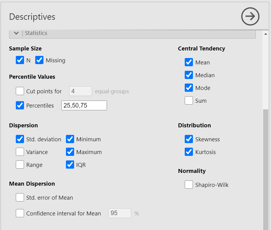 We can now select the relevant descriptive statistics in the Statistics section: