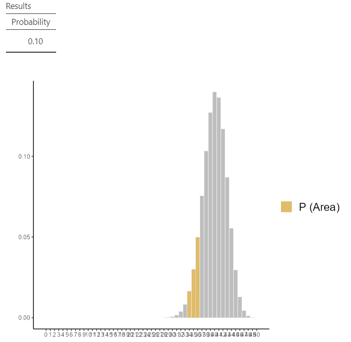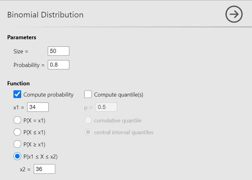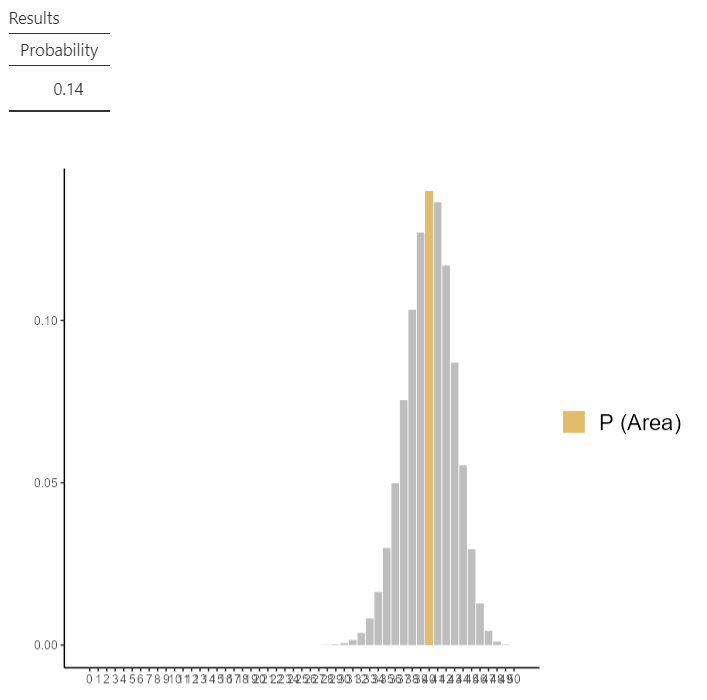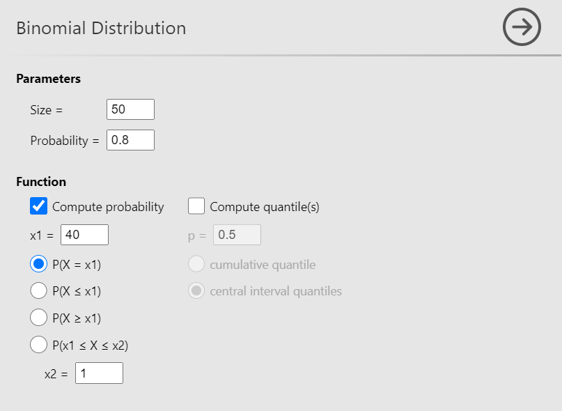 Now, define the parameters Size = 50 and Probability = 0.8. Then check the Compute probability box, select \(P(X = x1)\) (the default) and set x1 = 40, as shown below (Figure 13.4):