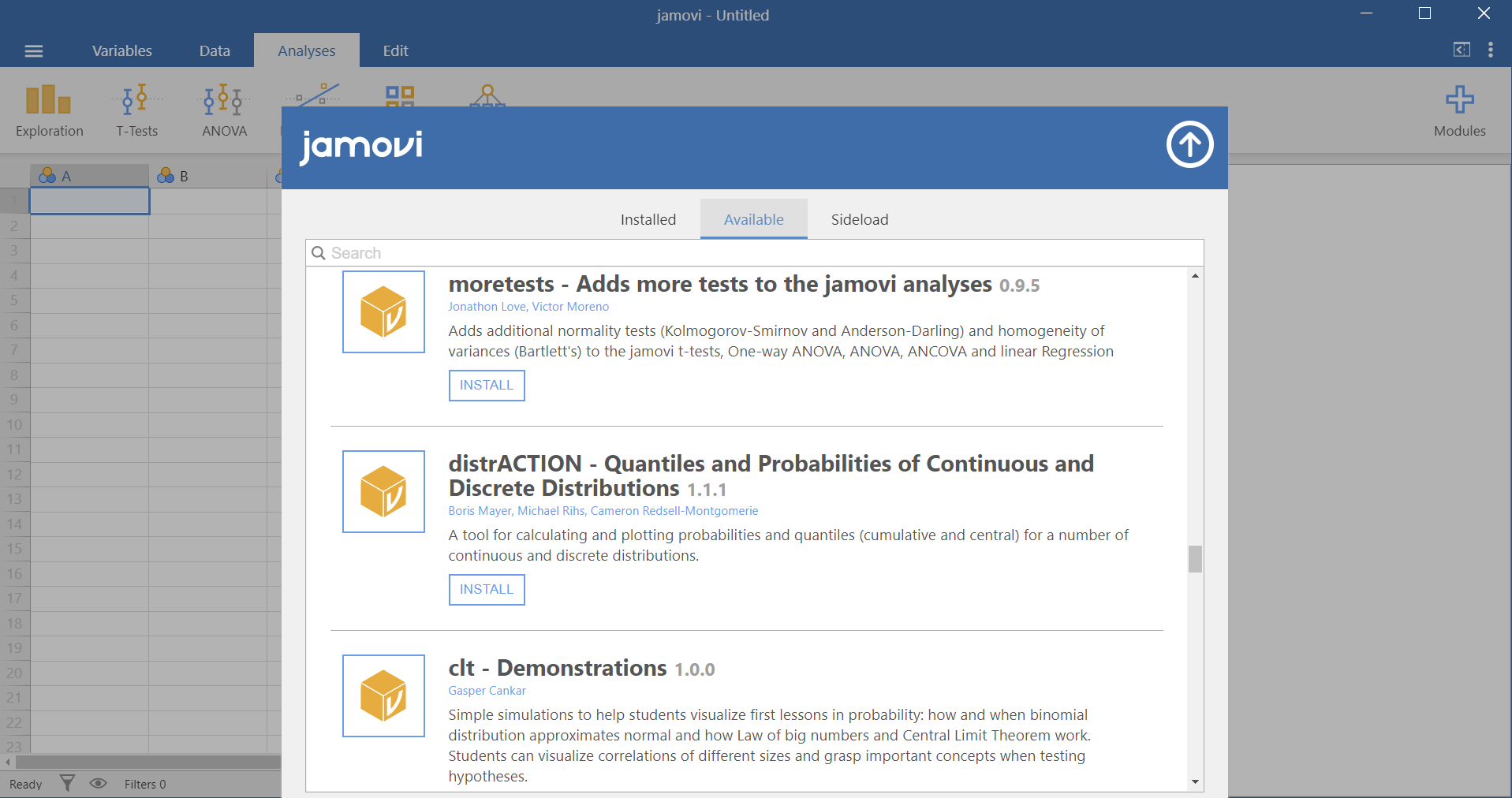 Some useful analyses are not pre-installed in Jamovi, but we can access them very easily by installing modules. This is one of the very useful features of Jamovi. While other programs are very difficult to modify after you install them, it is very easy to add new analyses to Jamovi.