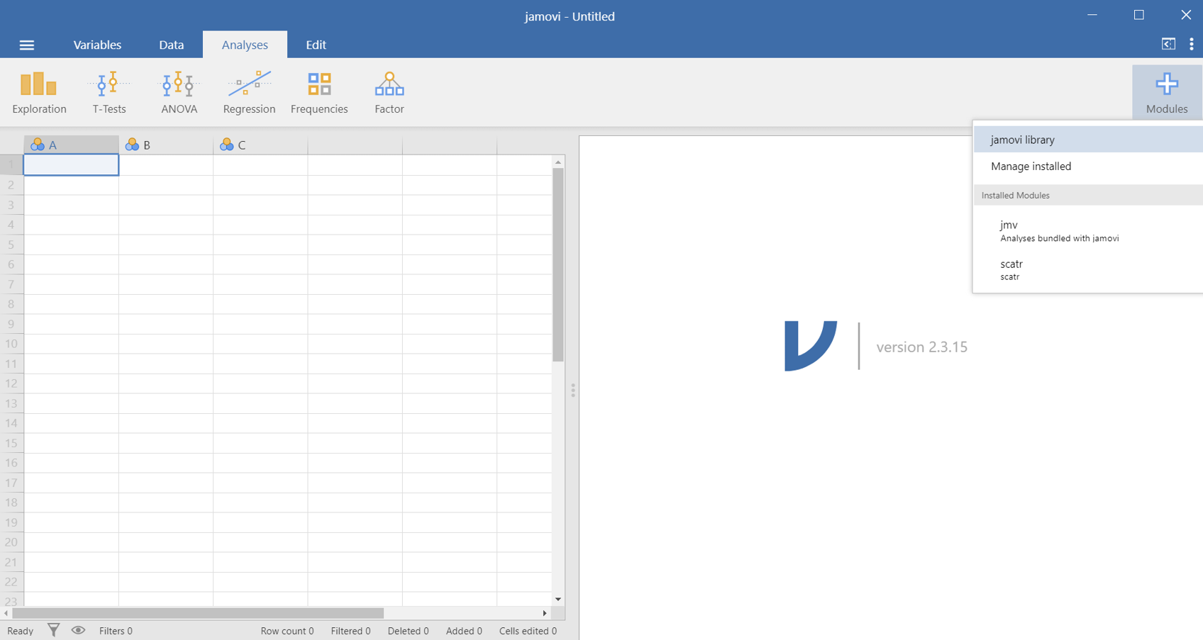. Then click on “Jamovi library” (Figure 13.1). This will show us the modules that Jamovi has preloaded.