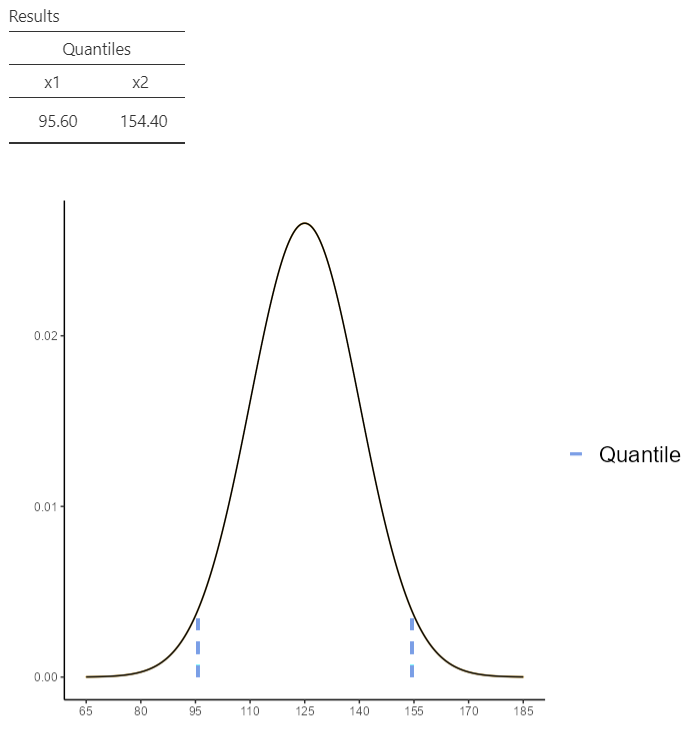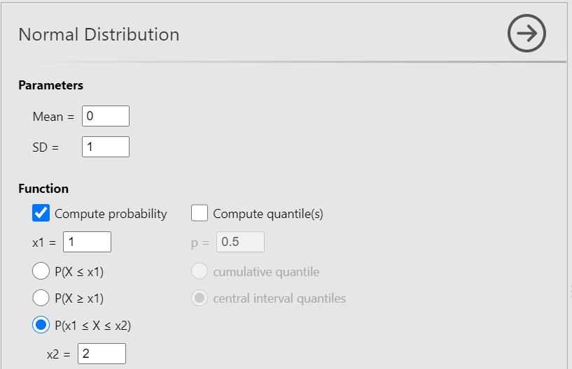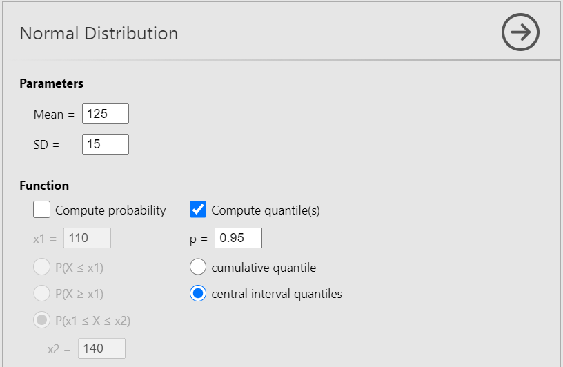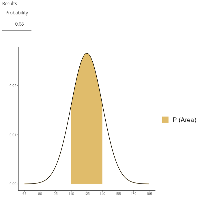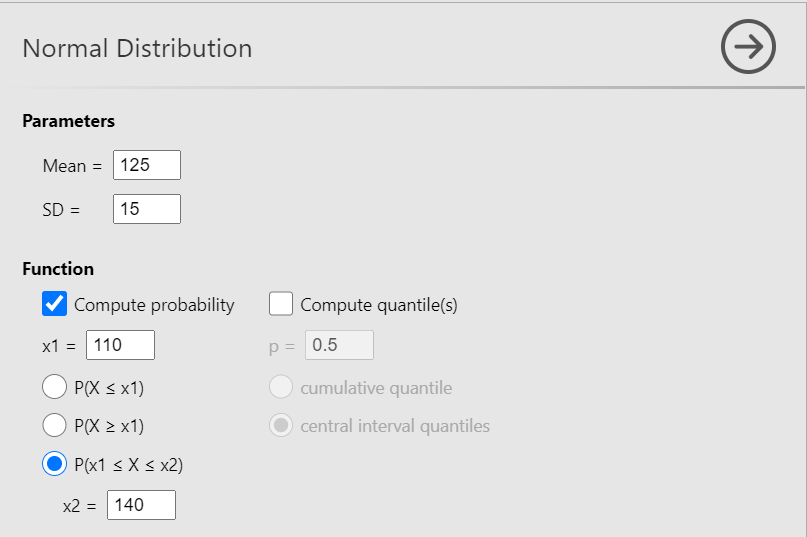 Now, define the parameters Mean = 125 and SD = 15. Then check the Compute probability box, select \(P(x1≤ X ≤x2)\) and set x1 = 110 (125-15) and x2 = 140 (125 + 15), as shown below (Figure 13.14):