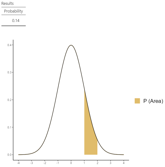 Calculate the area between \(z_1\)=1 and \(z_2\)=2 of a Standard Normal distribution.