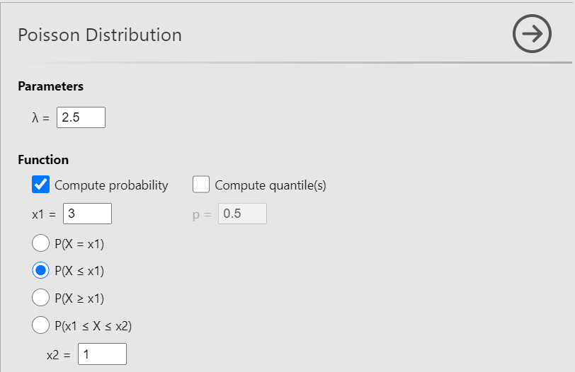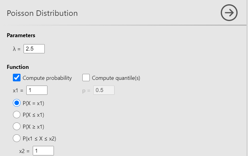 Now, define the parameter λ= 2.5. Then check the Compute probability box, select \(P(X = x1)\) (the default) and set x1 = 1, as shown below (Figure 13.9):