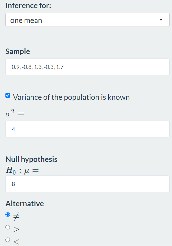 First, we select from the drop down menu Inference for one mean. Then we set the Null hypothesis: \(H_{0}: μ= 8\) and the Alternative \(\neq\) (two sided test). We also check the box of variance of the population, where we type \(\sigma^2 = 4\), as shown below (Figure 15.3):