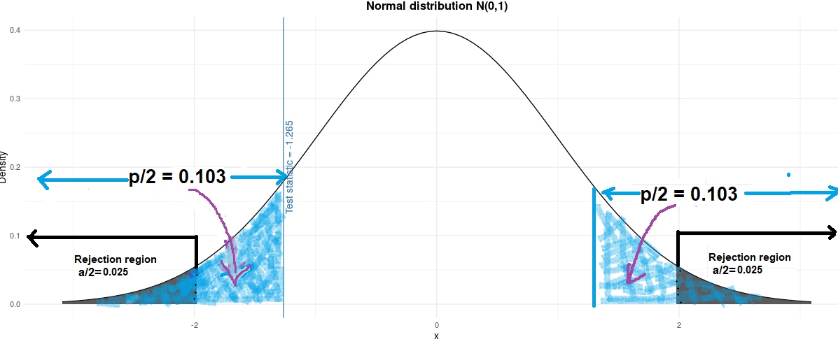 In our example, we observe that the p-value for a two-sided test is equal to 2*0.103= 0.206 > 0.05 (Figure 15.6). So, the sample mean and the mean of the population does not differ significantly in days to recover from the disease, we can not reject the null hypothesis, \(H_{0}\).