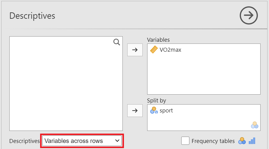 The Descriptives dialogue box opens. Drag the variable VO2max into the Variables field and split it by the VO2max variable. Additionally, select Variable across rows, as shown below (Figure 17.17):
