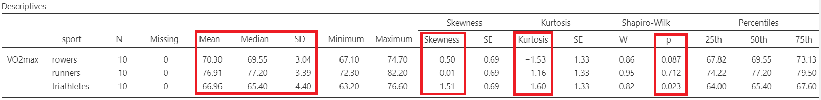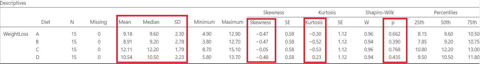 The means are close to medians and the standard deviations are also similar indicating normal distributions for all groups. Additionally, both shape measures, skewness and (excess) kurtosis, have values in the acceptable range [-1, 1] which indicate symmetric and mesokurtic distributions, respectively.