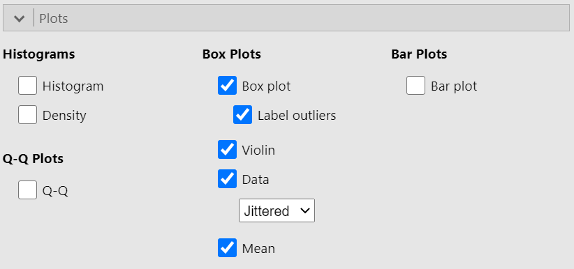 Next, in the Plots section we can visualize the distribution of VO2max for the three groups. From Box Plots choices tick the boxes of Box Plot, Violin, Data and Mean, as shown below (Figure 17.19):