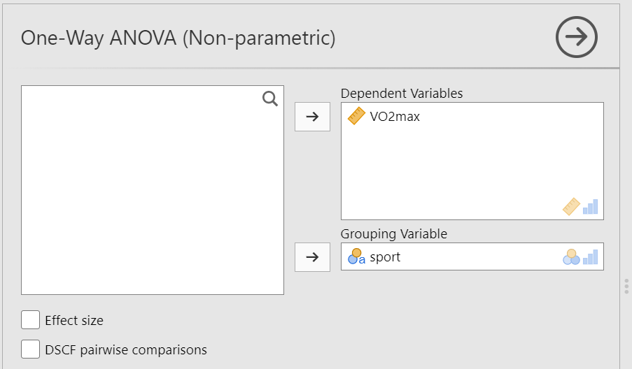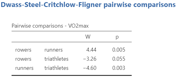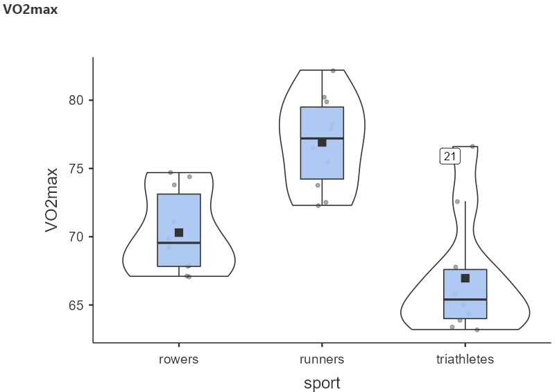 The dataset “dataVO2” includes 30 participants and has two variables. The numeric VO2max variable and the sport variable (with levels rowers, runners, and triathletes).