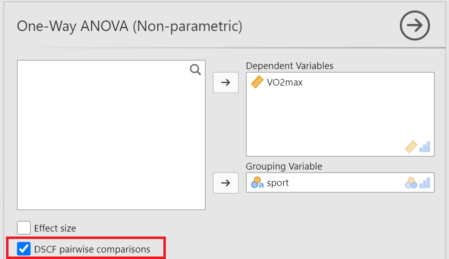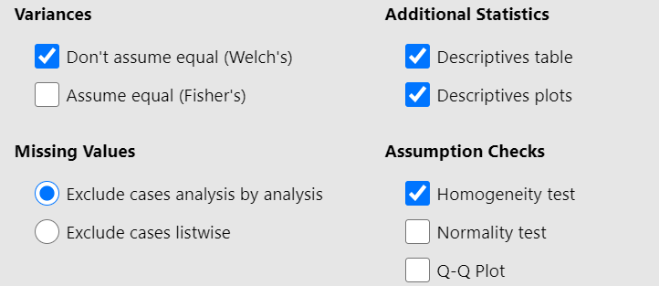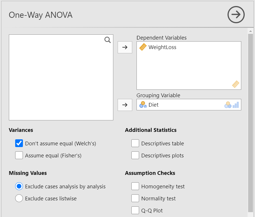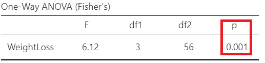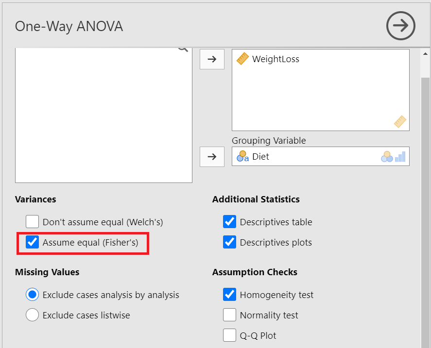 Since p = 0.583 > 0.05, the \(H_0\) of the Levene’s test is not rejected and we have to perform the Fisher’s test which assumes equal variances (Figure 17.10). So, let’s tick on the Assume equal (Fisher’s) box. (NOTE: If the \(p \geq 0.05\), then the population variances of WeightLoss in all groups are assumed equal).
