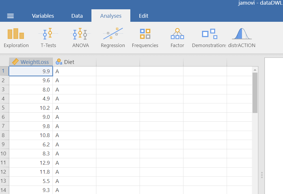 The dataset “dataDWL” has 60 participants and includes two variables (Figure 17.1). The numeric WeightLoss variable and the Diet variable (with levels A, B, C and D).