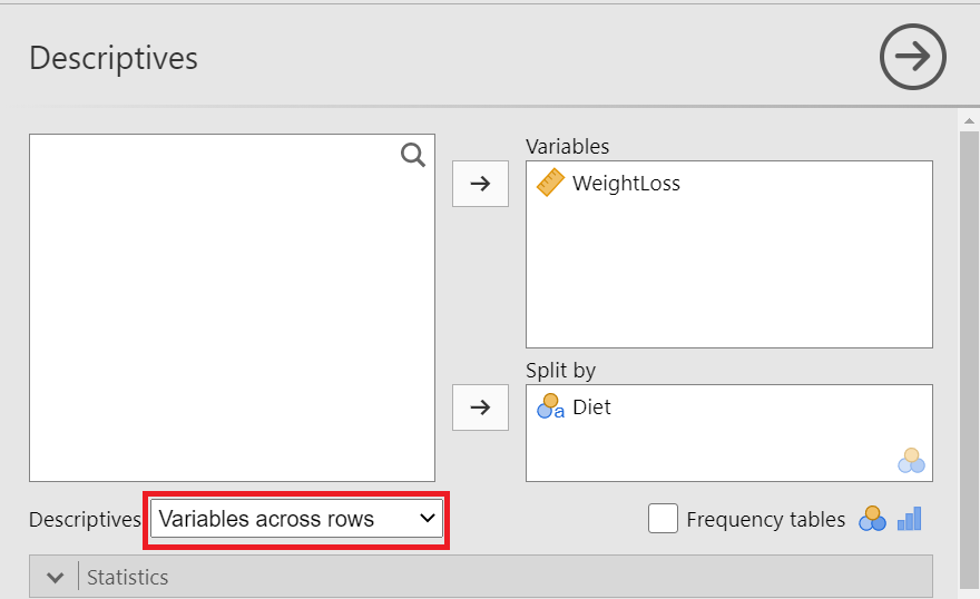 The Descriptives dialogue box opens. Drag the variable WeightLoss into the Variables field and split it by the Diet variable. Additionally, select Variable across rows, as shown below (Figure 17.2):