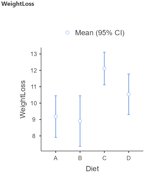 The Shapiro-Wilk tests of normality suggest that the data for the WeightLoss in all groups are normally distributed (p > 0.05 \(\Rightarrow H_0\) is not rejected).