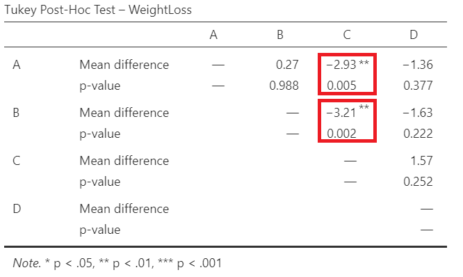 The p-value=0.001 is less than 0.05 (reject \(H_0\) of the ANOVA test). There is at least one diet with mean weight loss which is different from the other means.