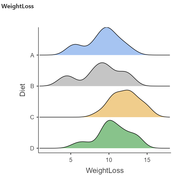 The above density plots show that the data are close to symmetry and the assumption of a normal distribution is reasonable for all diet groups.