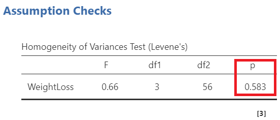 \(H_{0}\): the variances of WeightLoss in all groups are equal (\(σ^2_A=σ^2_B=σ^2_C=σ^2_D\))