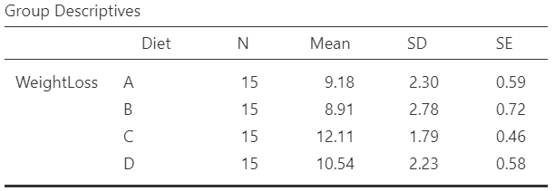 Consider the example of the variations between weight loss according to four different types of diet (A, B, C, and D). The question that may be asked is: does the average weight loss (units in kg) differ according to the diet?