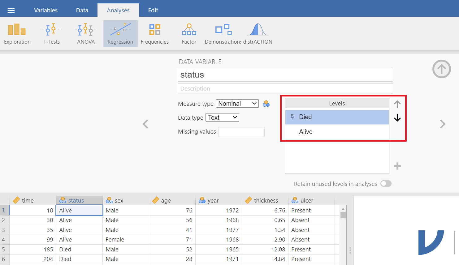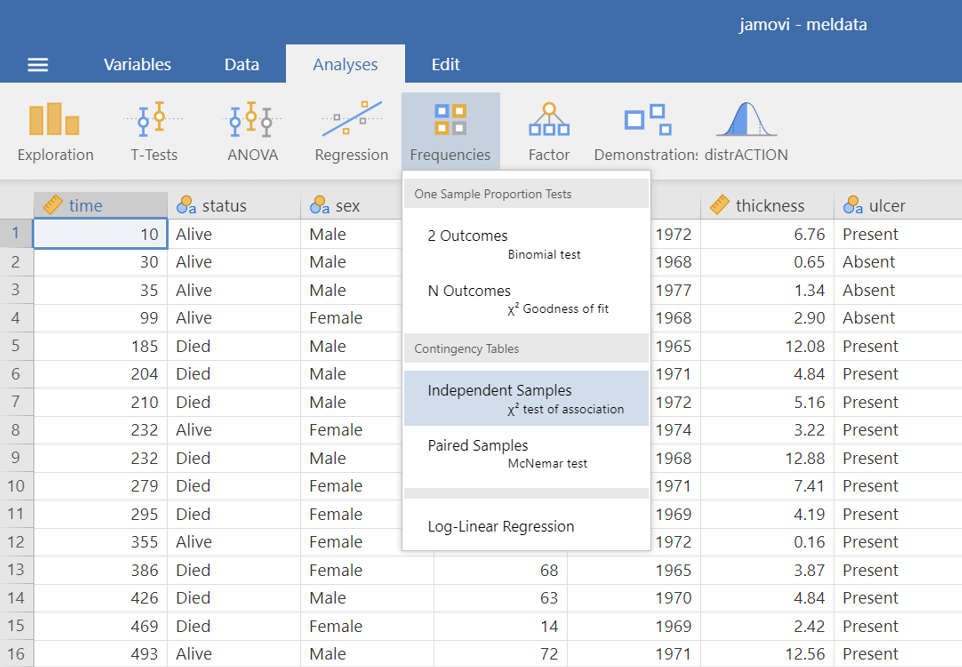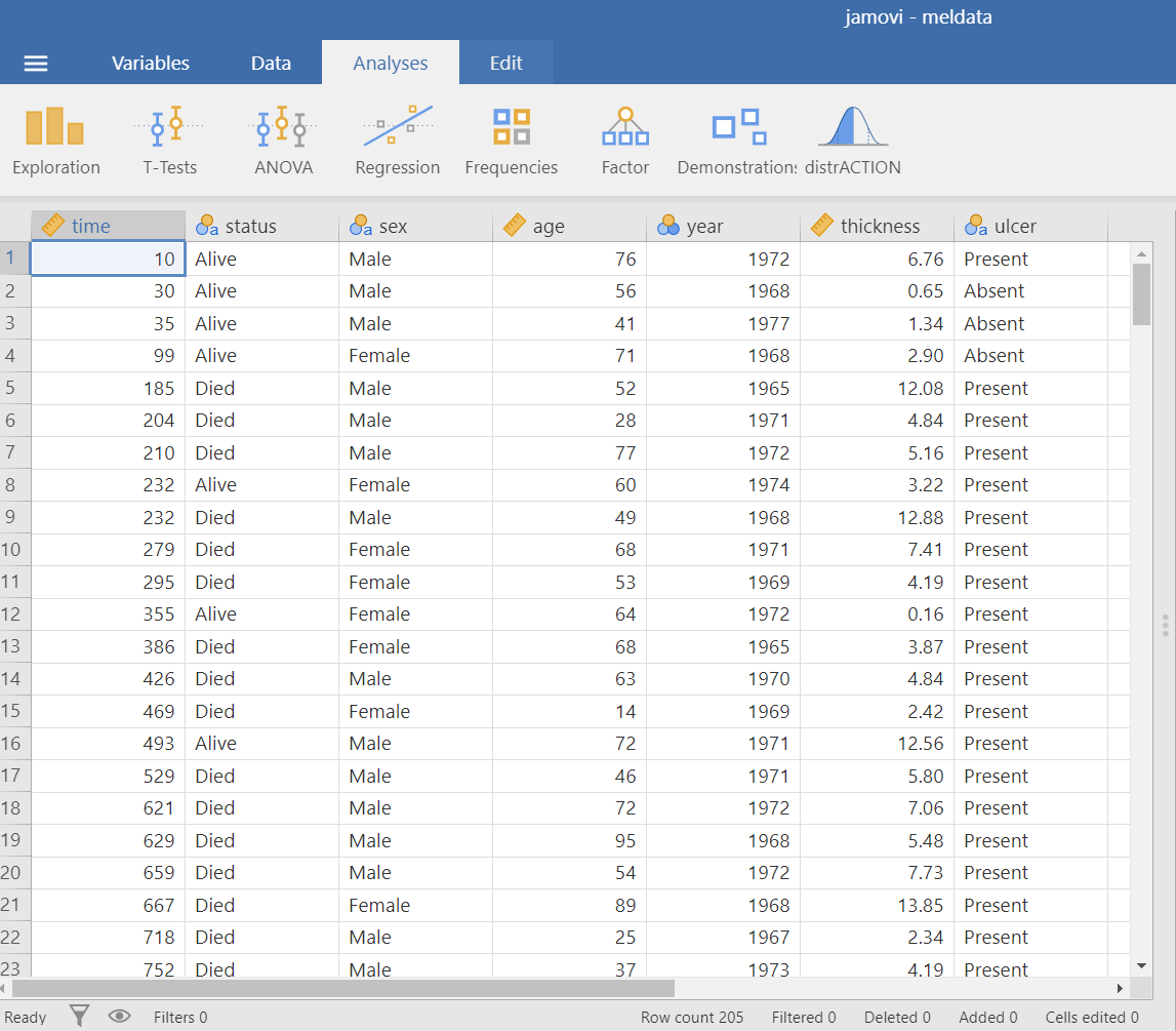 Open the dataset named “meldata” from the file tab in the menu: