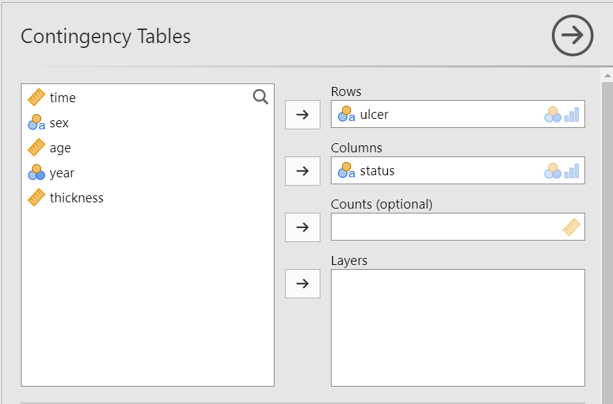 The Contingency Tables dialogue box opens. Drag the variable ulcer into the Rows field and the variable status into the Columns field, as shown below (Figure 18.2):
