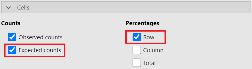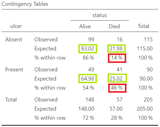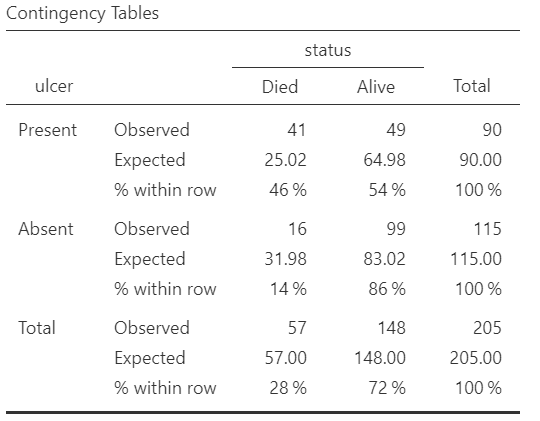 We will create a contingency 2x2 table with row percentages and the expected counts for the binary variables ulcer (Absent/Present) and satus (Alive/Died). In the Cells section, tick the Row and Expected counts boxes, as shown below (Figure 18.7):