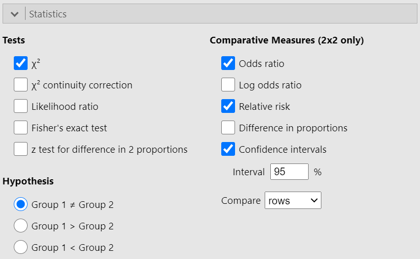 In the Statistics section, check the Relative risk, Odds ratio and Condidence intervals boxes, as follows (Figure 18.13):