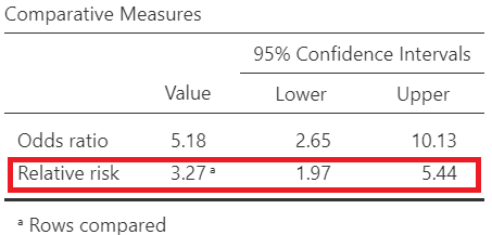 \[ Risk \ Ratio = \frac{\frac{41}{90}}{\frac{16}{115}} =\frac{0.4556}{0.1391} = 3.27\] Using Jamovi we get the following output (Figure 18.14):