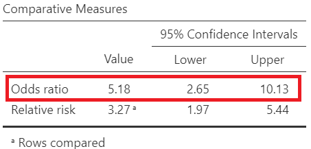 \[ Odds \ Ratio = \frac{\frac{41}{49}}{\frac{16}{99}} =\frac{0.837}{0.162} = 5.18\]
