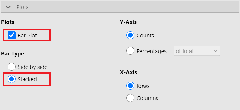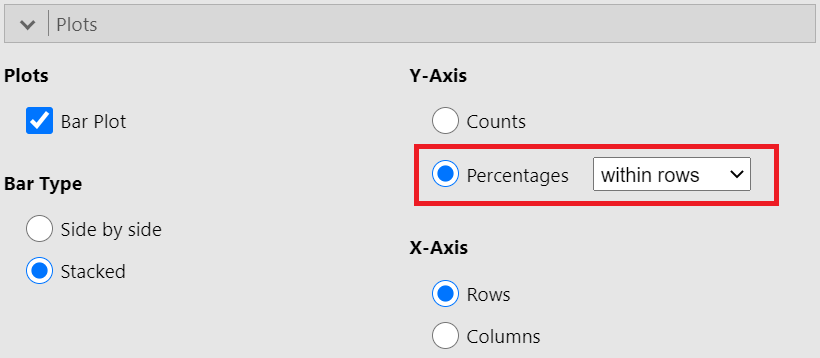 In practice, it is percentages we are comparing. Let’s create a stacked bar plot with percentages. In the Plot section, now, check the Percentages and within rows, as shown below (Figure 18.5):