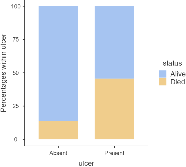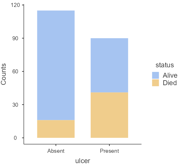 The dataset “meldata” includes 205 patients and has seven variables. We are interested in association between the binary variables ulcer (Absent/Present) and satus (Alive/Died)(Figure 18.1).