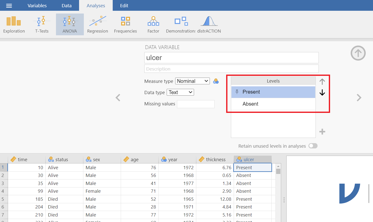 First we need to reshape the contingency table. Double click on the variable name ulcer and change the order of levels using the (up/down) arrows as follows (Figure 18.10):
