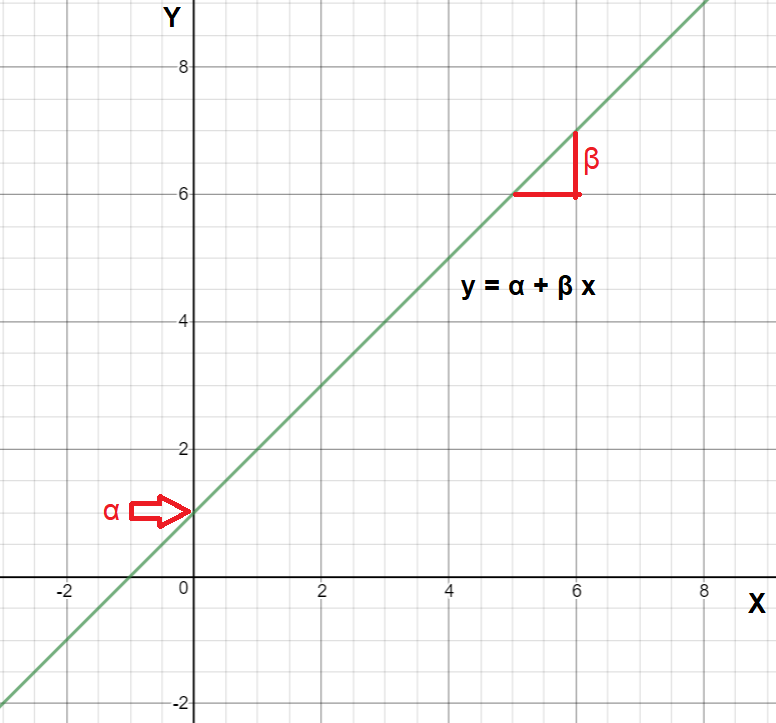 We may recall from secondary/high school algebra that the equation of a line is: \[y = \alpha + \beta \cdot x \tag{10.1}\]